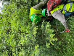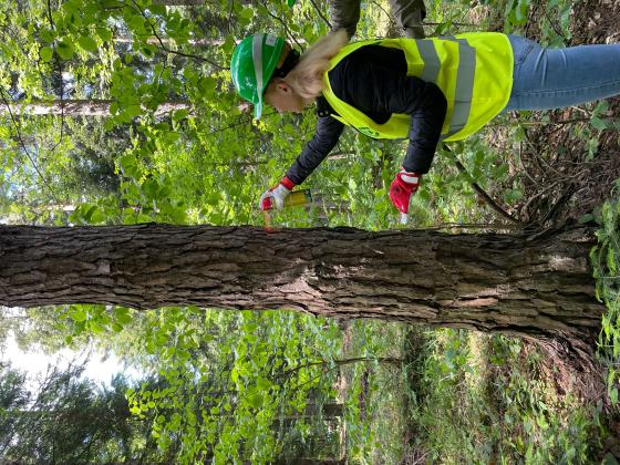 Uczestnicy poznawali także technologię pozyskiwania drewna. Pracownicy Zakładów Usług Leśnych demonstrowali różne techniki ścinki, a wspólnie z leśniczym, dokonującym klasyfikacji i odbiórki drewna, także manipulacji (podziału na sortymenty) surowca.